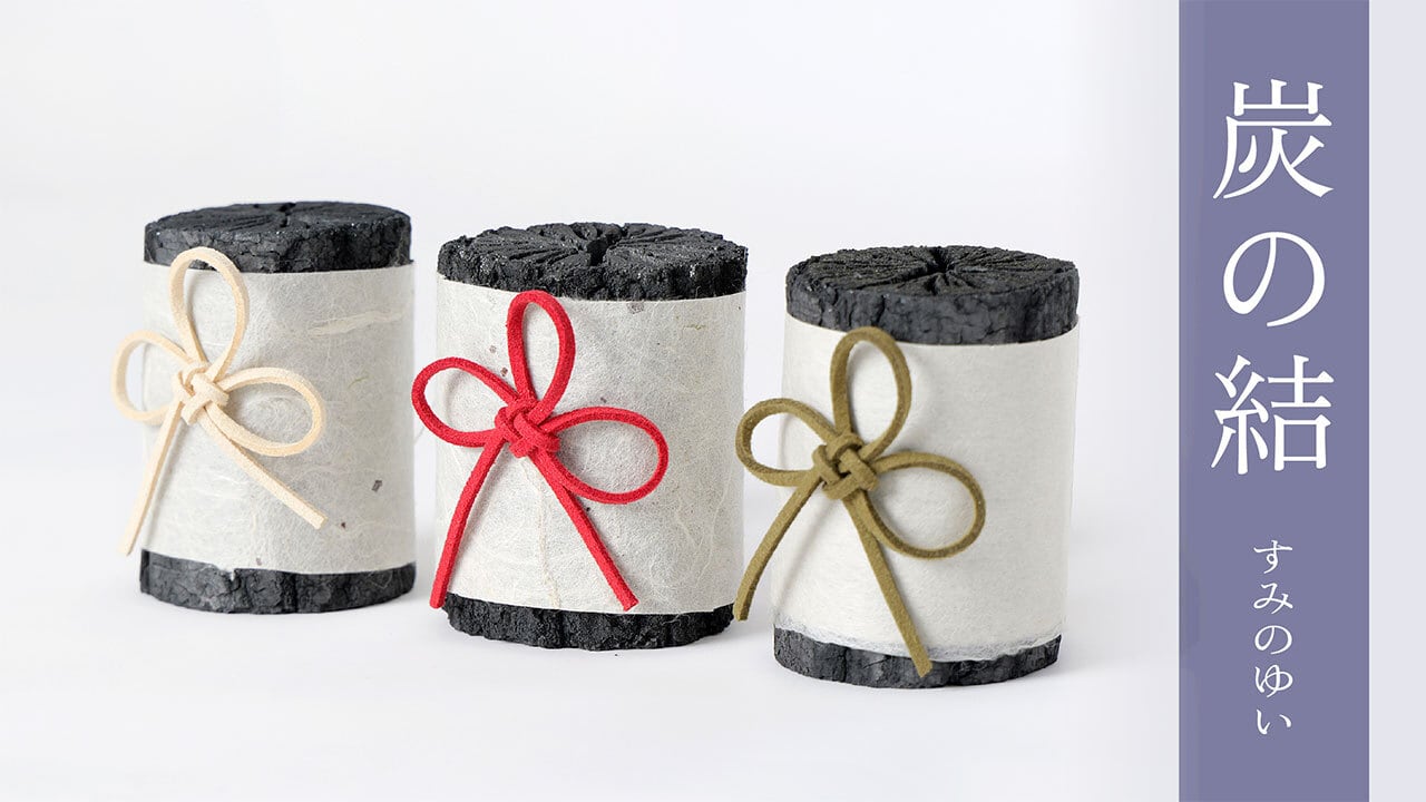 切り口が雅やかな菊炭を山形県川西町の伝統美・月山和紙で包み、縁起の良い「かなう結び」で仕立てたインテリア用炭です。